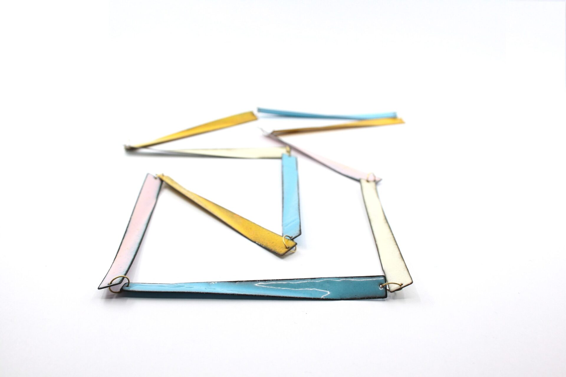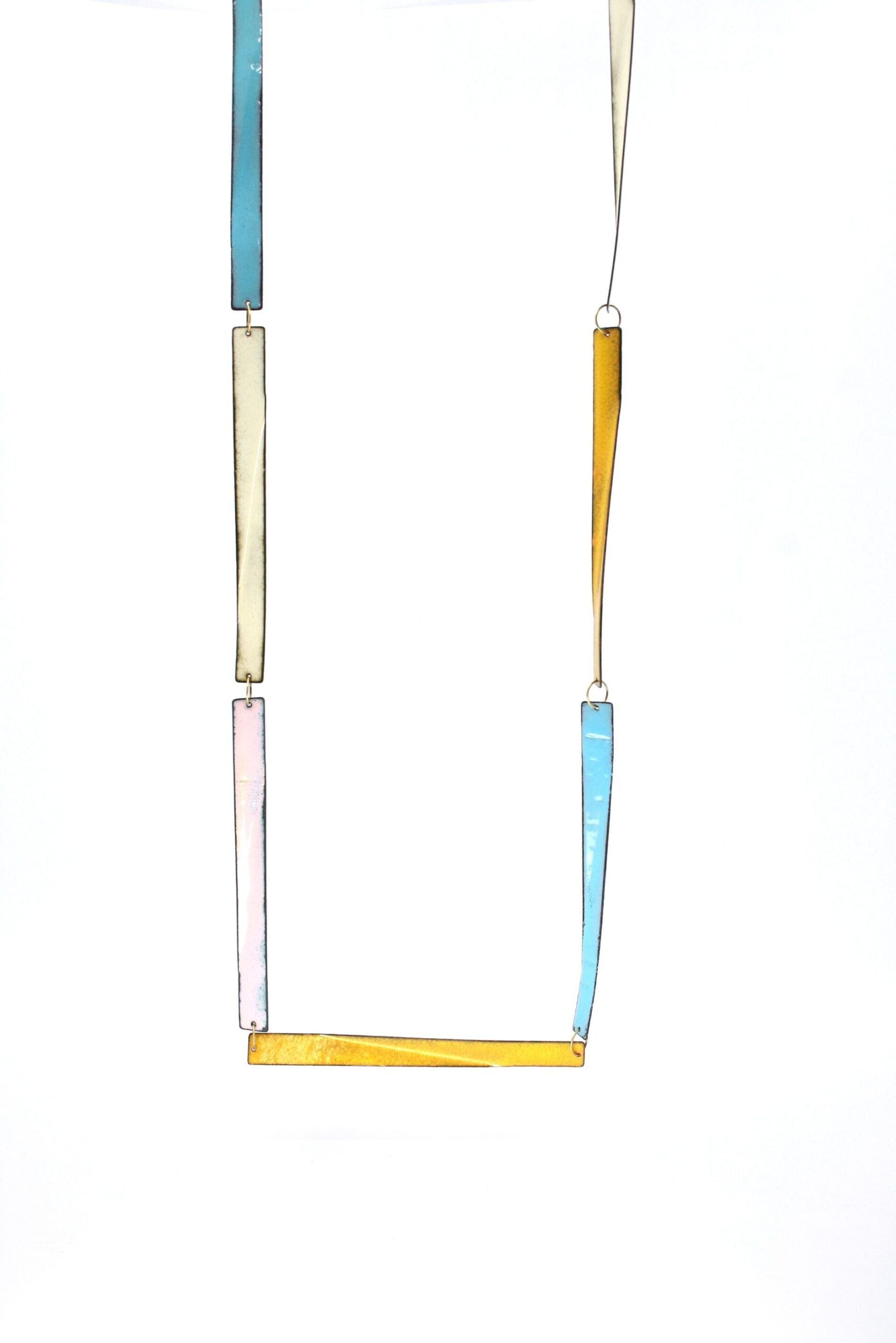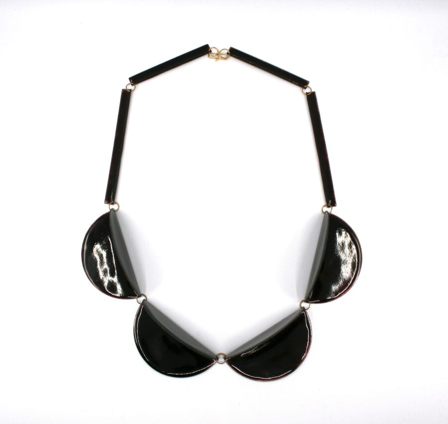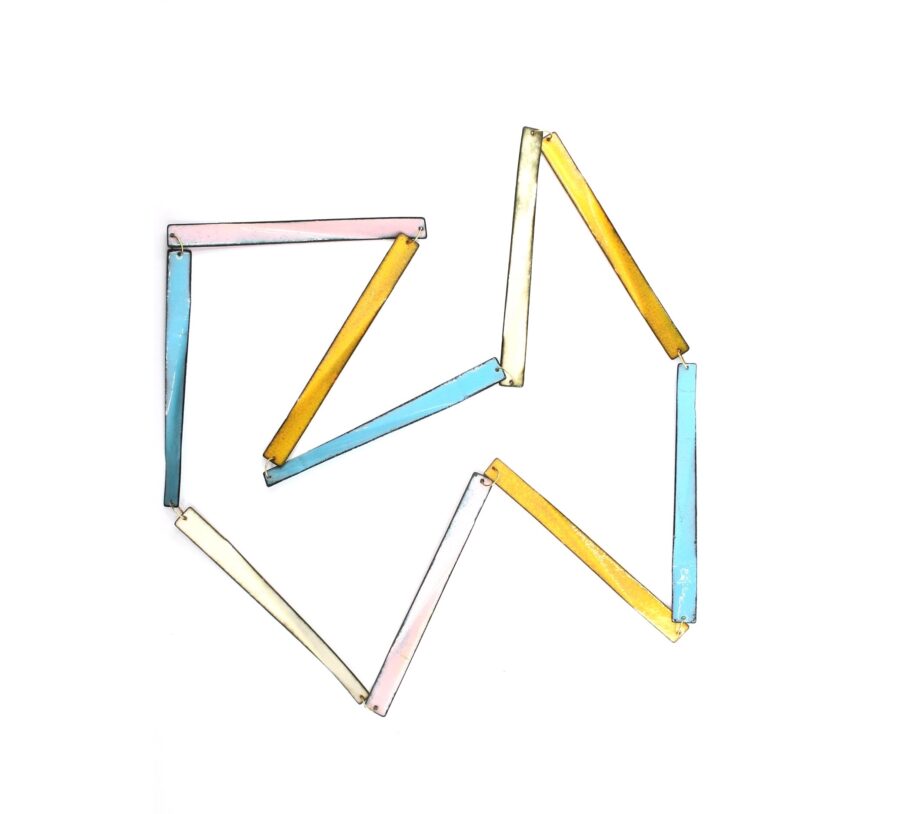Harmonie et rigueur mènent cet artiste sur les voies de ses créations personnelles. La clarté de son langages formel lui permet d’aborder la parure sous l’angle d’une géométrie dans laquelle la lumière occupe une place de choix, celle de l’ivresse des profondeurs de ce quatrième état de la matière à laquelle le poète nous confronte. Maniant les courbes et les angles de pliage, elle crée des raccourcis dans lesquels notre vision percute d’autres modules, dédoublant le corps de cette matière passée au feu. Les vitrifications successives modifiant la surface, l’artiste influe sur notre perception, ouvrant par le jeu des transparences un monde de couleurs aux horizons reliant passé et futur.